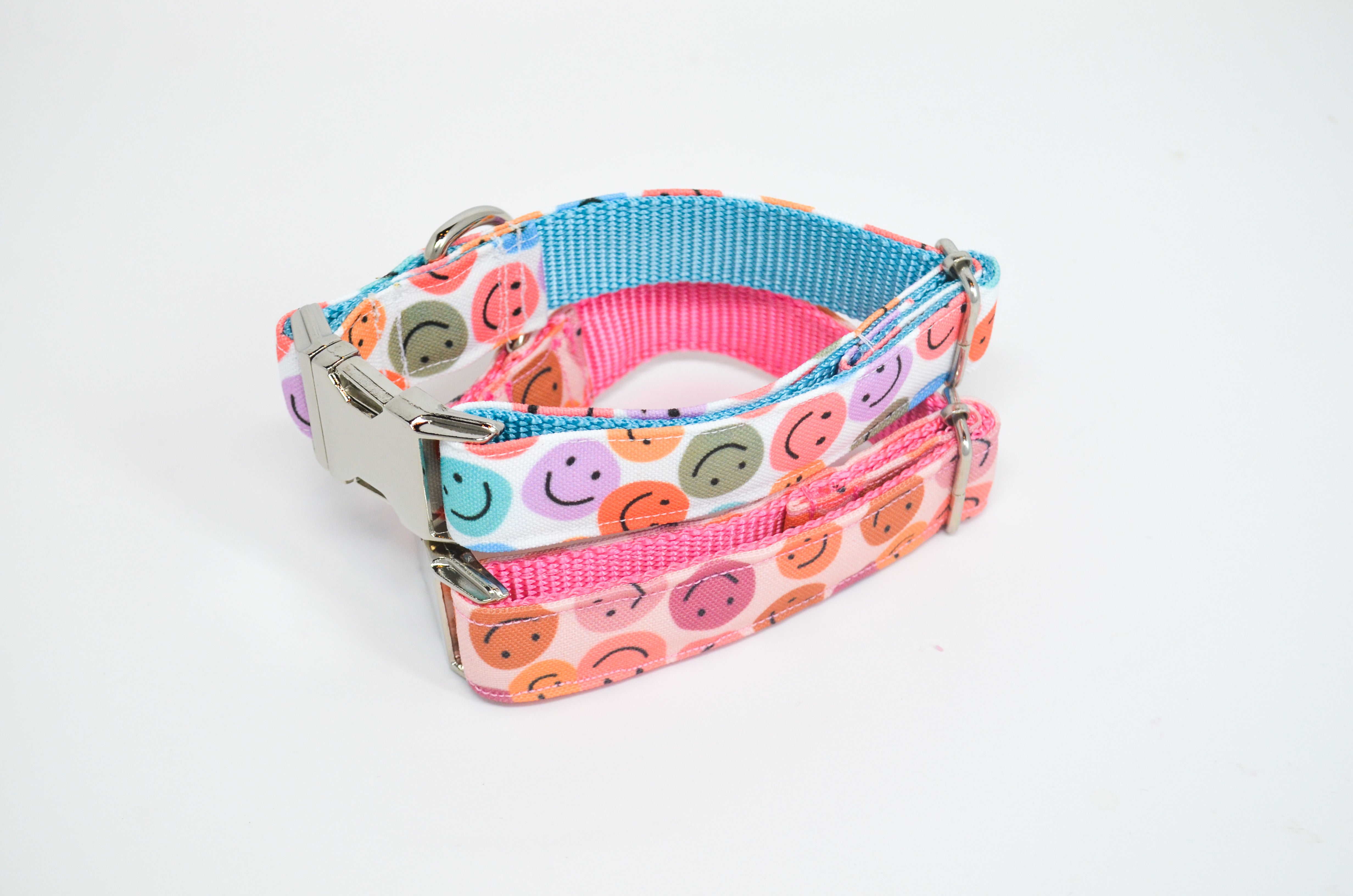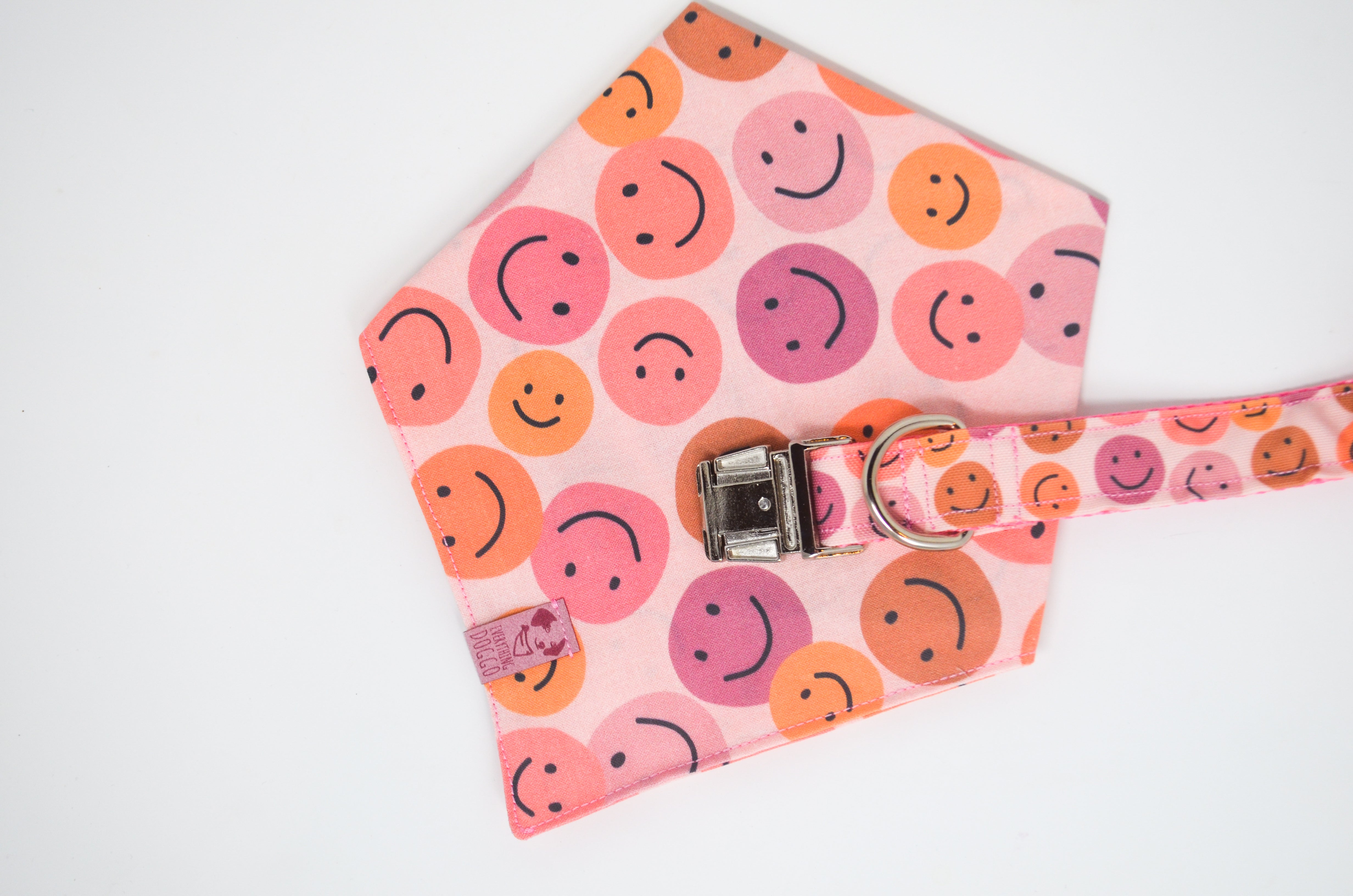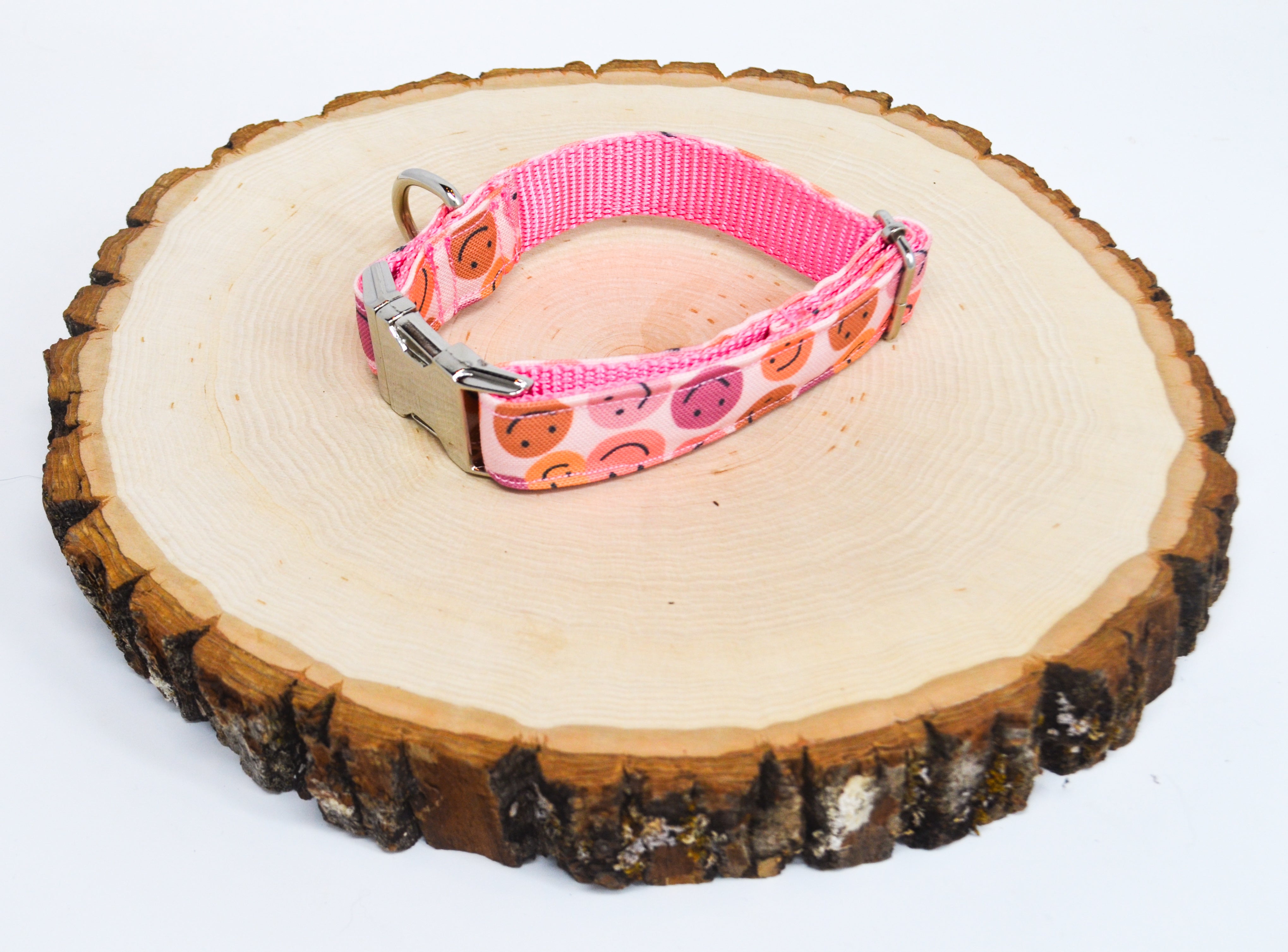 Dog collar featuring happy smiley faces in shades of pink and purple.