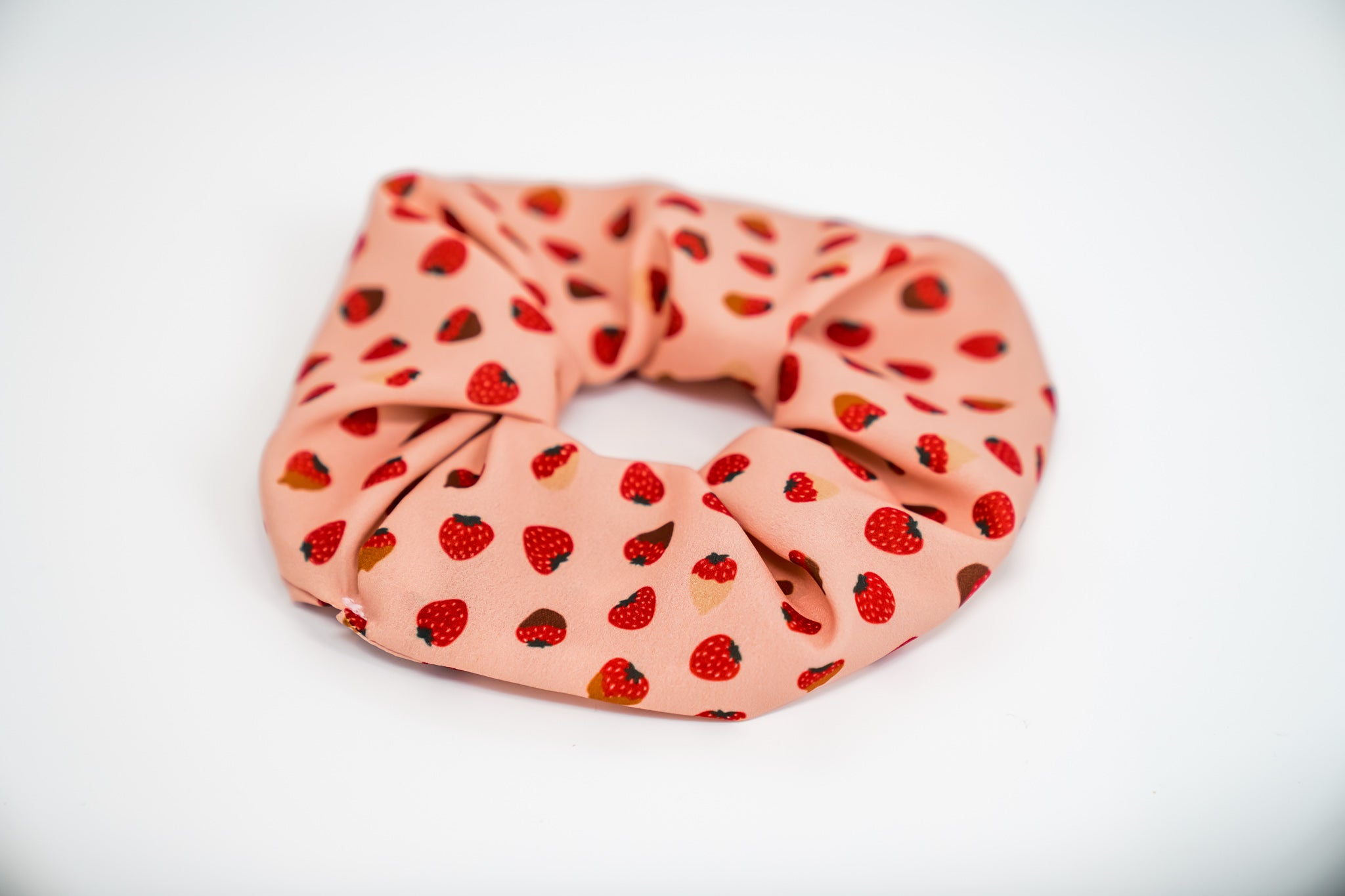 Silky scrunchie featuring chocolate covered strawberries on peach pink.
