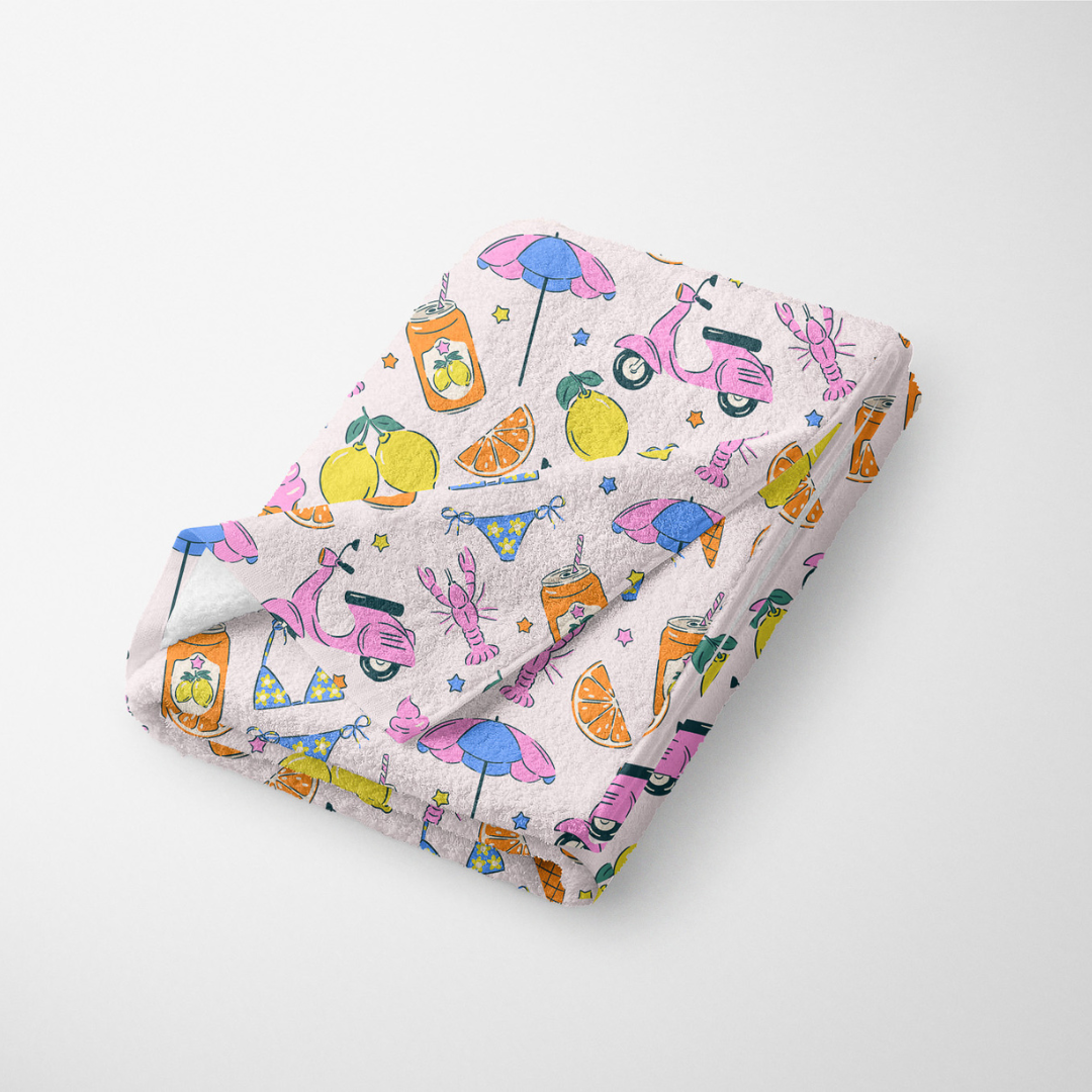Our towels come in 30" x 60." Each towel comes with print on the front side and white cotton on the back side.