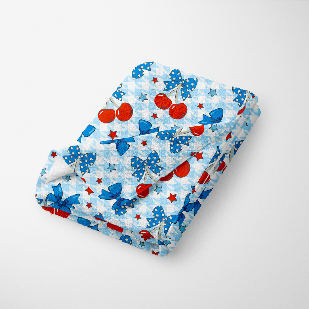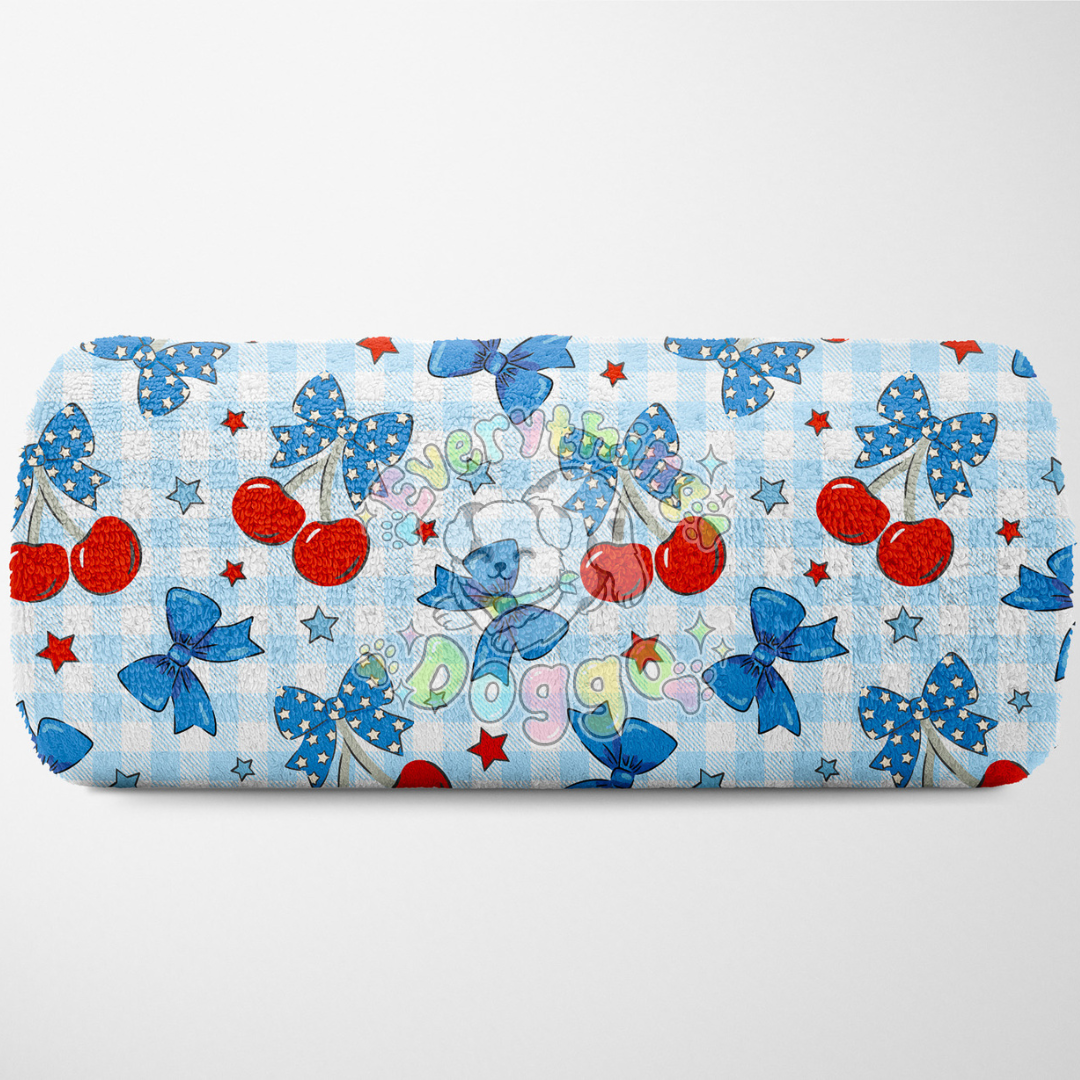 Our towels come in 30" x 60." Each towel comes with print on the front side and white cotton on the back side.